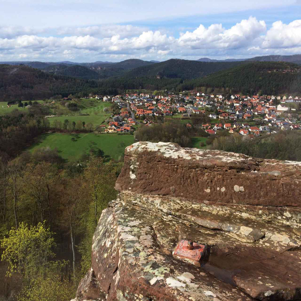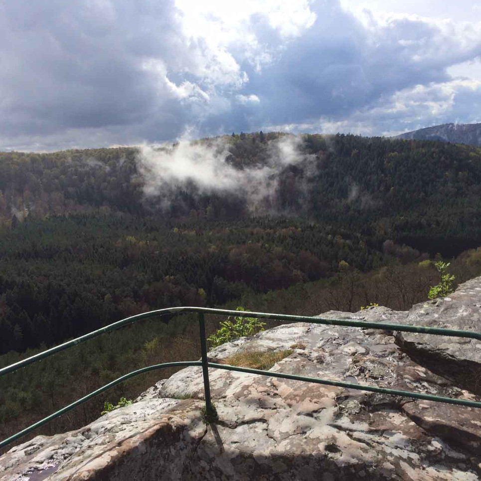 Bizarre Felsen, herrliche Aussichtspunkte, idyllische Wiesentäler und die Burgruine Drachenfels prägen diese Tour. Länge 14,5 km und ca. 480 Höhenmeter, Einkehr erst nach 11 km in der Drachenfelshütte, deshalb etwas Getränke mitnehmen.